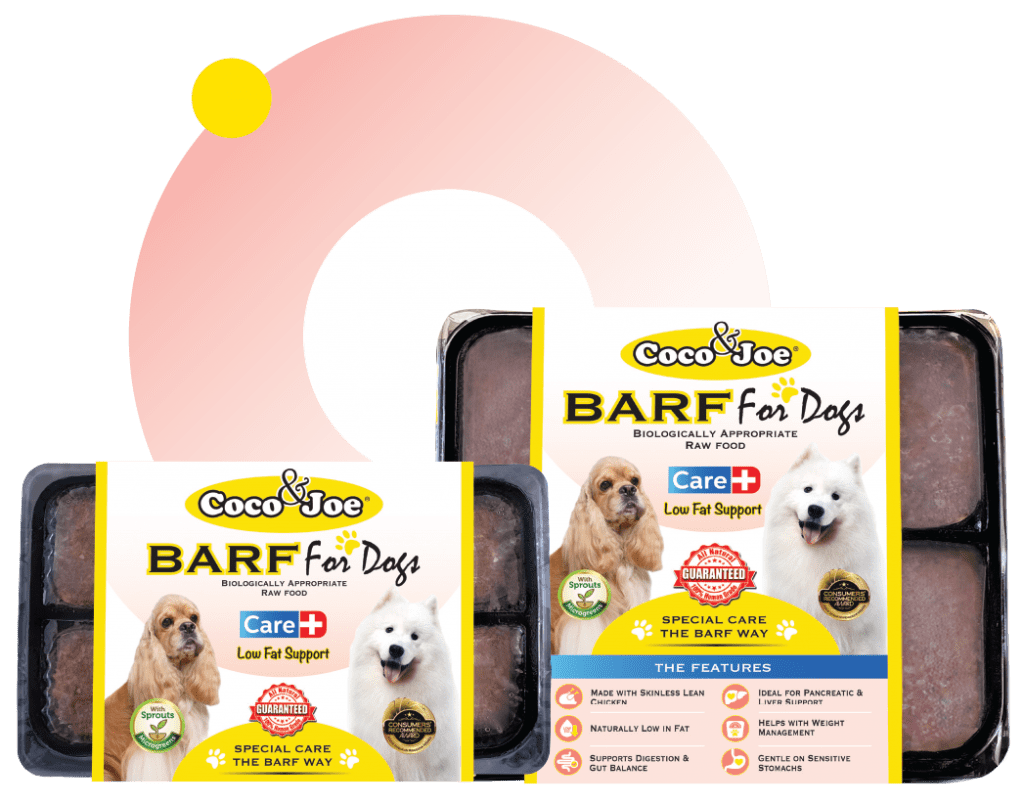 Coco & Joe Care Plus Low Fat Support is a gently balanced BARF recipe designed for dogs who benefit from reduced-fat meals. Made with lean, skinless chicken, egg white and vegetables, it provides clean, high-quality protein with minimal fat. It is ideal for dogs with: