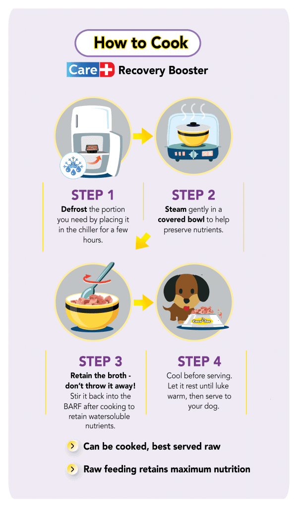 While steaming is an option, we recommend serving raw whenever possible to preserve enzymes and heat-sensitive nutrients. Recovery Booster is gentle on digestion, highly palatable, and an ideal choice for dogs needing extra care and support.